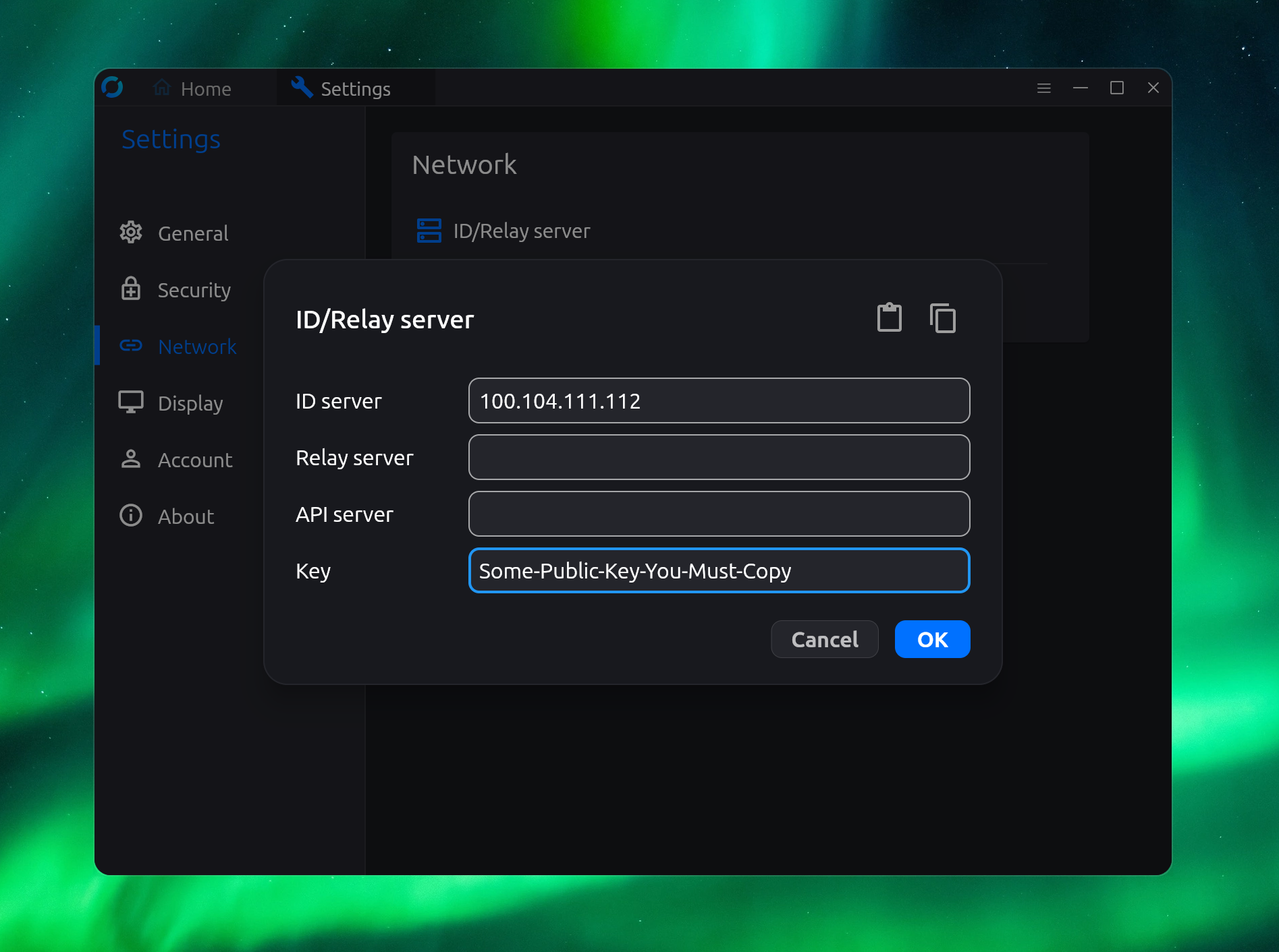 Now, in the Rustdesk client, go to Settings -> Network -> ID/Relay server and input the relay server ip address (in the above example: 100.104.111.112) or the name (in the above example: server-1).